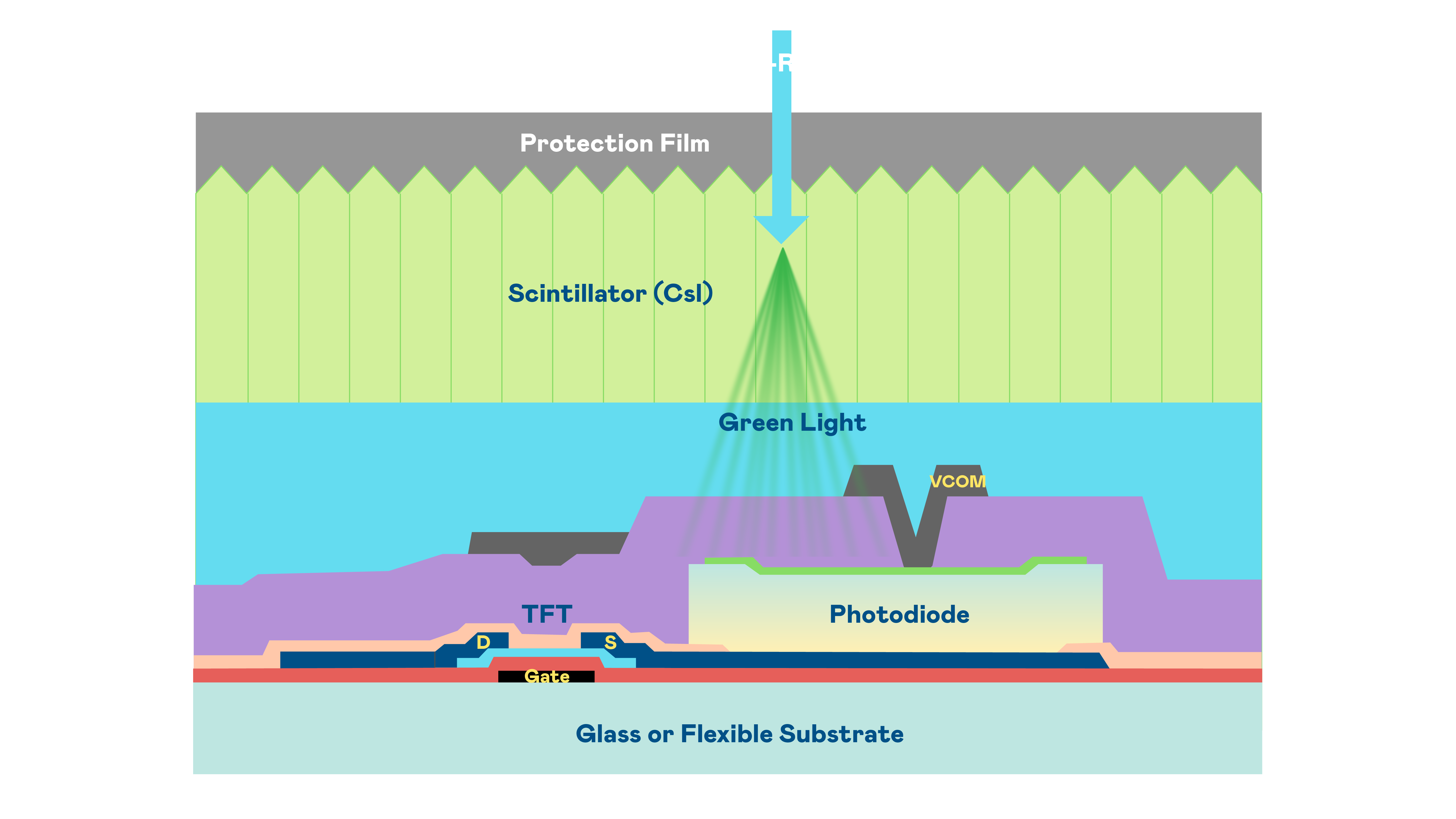 G22恒峰的X光影像感测阵列使用薄膜电晶体 (TFT) 作为每个像素的读取开关,搭配光电二极体(Photodiode)的光电转换元件,用以感测X光影像讯号。